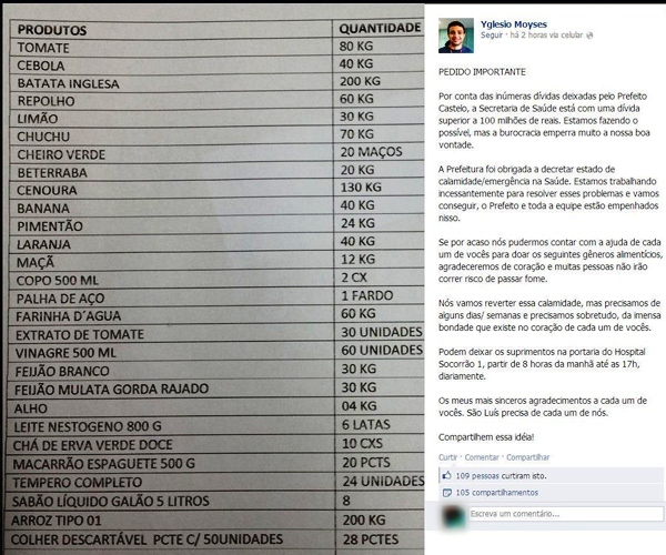 Na lista de pedidos do diretor do Hospital, foi pedido tomate, cebola, batata inglesa, repolho, chuchu, pimentão, beterraba, tempero completo, leite nestogeno, feijão mulata gorda rajado, cenoura, entre outros legumes.