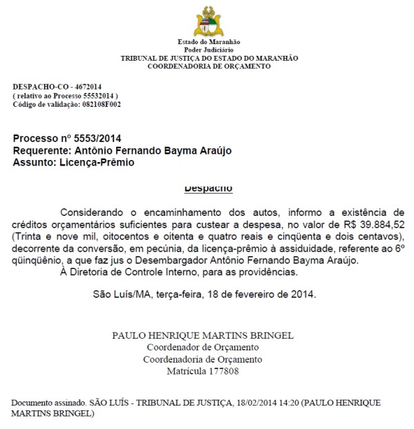 O desembargador Antônio Fernando Bayma Araújo, decano do Tribunal de Justiça do Maranhão (TJMA), também não poderia ficar de fora do que contraria até mesmo o próprio Conselho Nacional de Justiça (CNJ), exceto se o magistrado entre em processo de aposentadoria.