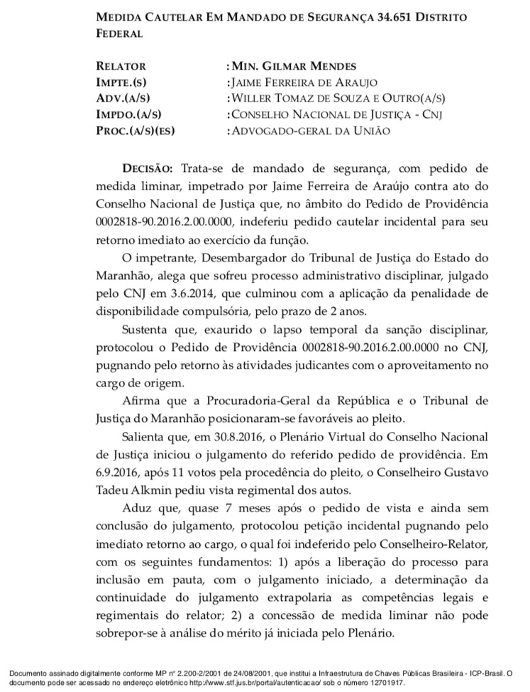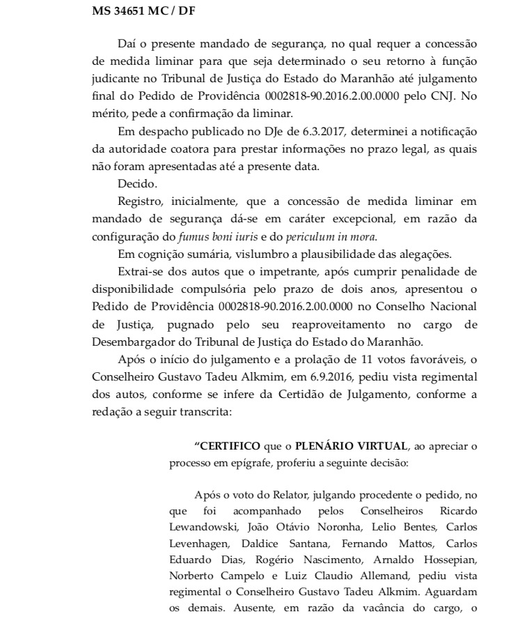 O retorno do magistrado maranhense decorre de decisão do ministro do Supremo Tribunal Federal (STF), Gilmar Mendes, que acolheu o pedido da defesa.