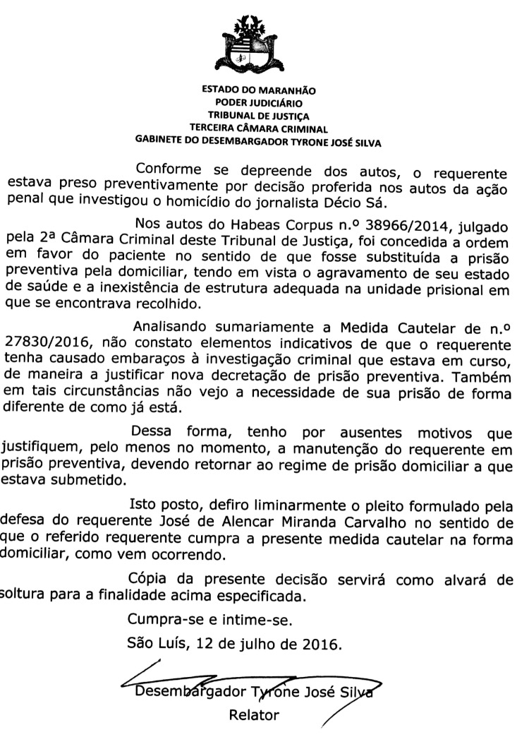 O desembargador titular Tyrone José Silva reformou a decisão do desembargador Raimundo Melo, que mandou prender o prefeito de Paulo Ramos e José de Alencar Miranda Carvalho, pai do agiota Glaucio Alencar, preso acusado de tramar a morte do jornalista Decio Sá.