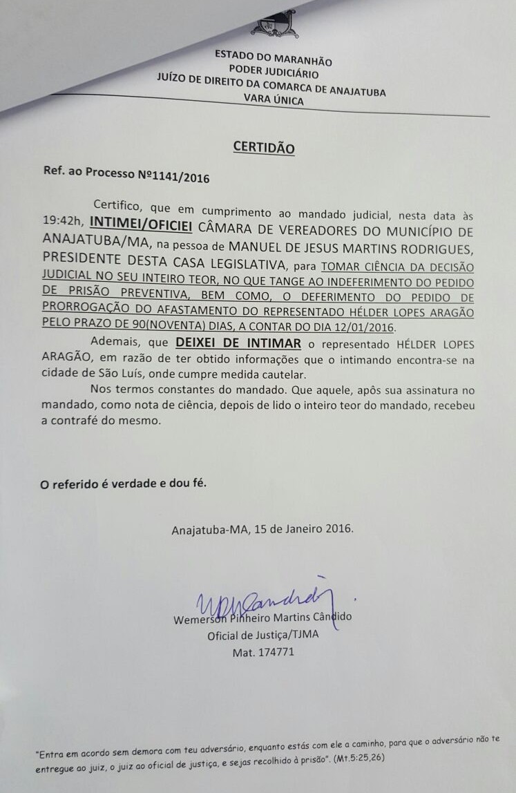 “Desse modo, levando em conta os fundamentos já lançados na decisão de fls. 3222/3239 dos autos de n.0 28875/2015, os quais ora reitero, que determinou o afastamento do representado Helder Lopes Aragão do cargo de Prefeito Municipal de Anajatuba/MA, bem como os acima acrescentados, o pedido do Ministério Público Estadual no sentido de prorrogar esse afastamento pelo prazo de 90 (noventa dias), a contar do dia 12/01/2016, quando expirou o primeiro prazo de 90 (noventa) dias de afastamento efetivamente iniciado em 13/10/2015, o que faço com amparo na norma contida no art. 319, VI, do Código de Processo Penal. Ficam mantidas todas as demais disposições da decisão proferida acima citada.” finalizou o despacho.