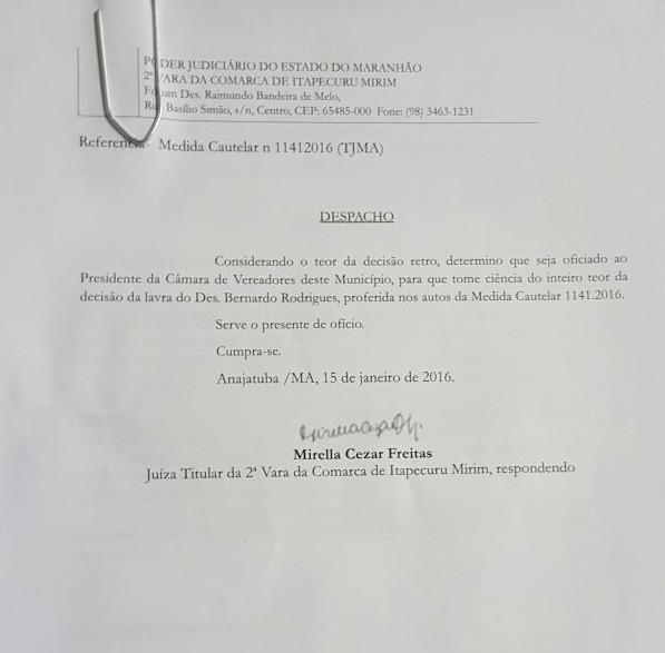Nas certidões abaixo, mostram que a juiza da cidade recebeu a decisão do desembargador na sexta-feira e, consecutivamente, deu despacho no mesmo dia encaminhando a decisão para Câmara de Vereadores.