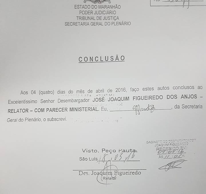 Certo é, que nesta quarta-feira (8) o processo será levado ao Pleno do Tribunal de Justiça do Maranhão (TJ/MA), conforme solicitação do desembargador José Joaquim Figueredo dos Anjos.