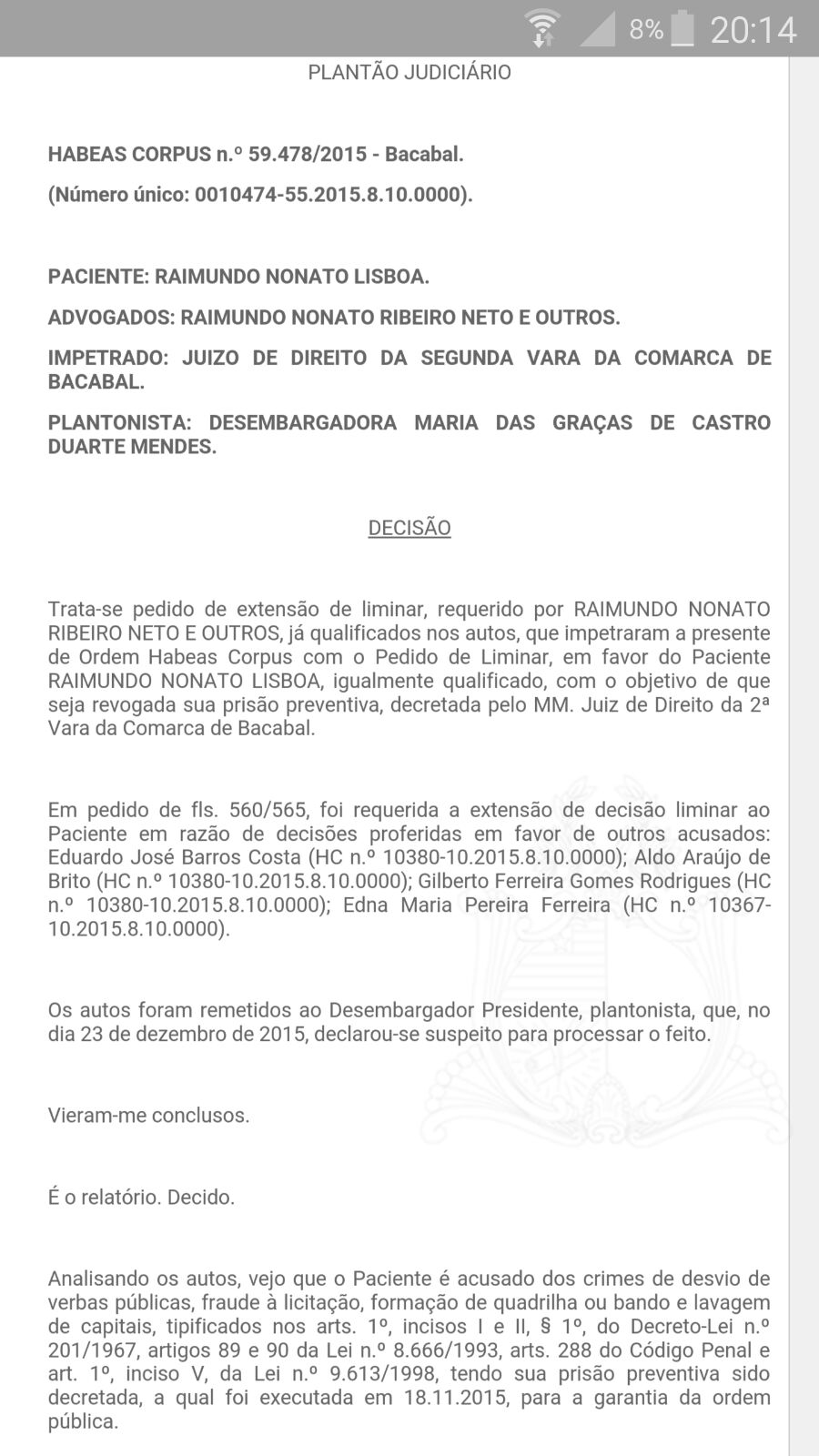 A desembargadora Maria da Graça concedeu, nesta terça-feira (29), o habeas corpus em favor de Raimundo Nonato Lisboa, ex-prefeito de Bacabal.
