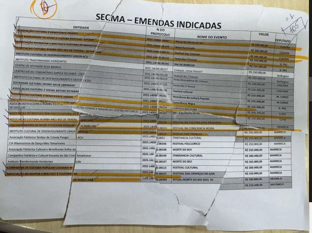 Depois da prisão da assessora da deputada Andreia Rezende (PSB), Larissa Rezende, a Polícia Federal encontrou documento com ela que tem nomes de dez parlamentares. Segundo o relatório da PF, os nomes dos deputados estaduais aparecem junto com nomes de associações, o título dos eventos, os valores destinados pela Secretaria de Cultura do Maranhão (Secma).