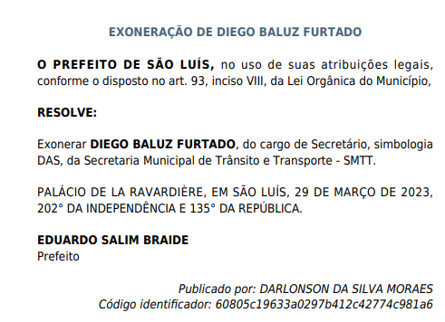Titular da Secretaria Municipal de Transporte (SMTT), Diego Baluz, foi exonerado do cargo pelo prefeito de São Luís, Eduardo Braide (PSD).