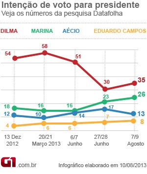 Após perder 21 pontos percentuais na corrida pelo Palácio do Planalto em meio aos protestos que tomaram as ruas do país em junho, a presidente Dilma Rousseff se recuperou e passou de 30% para 35% das intenções de voto, segundo pesquisa Datafolha publicada na edição deste domingo do jornal “Folha de S.Paulo”. O estudo, realizado entre os dias 7 e 9 de agosto, ouviu 2.615 entrevistados e tem margem de erro de dois pontos percentuais para mais ou para menos.