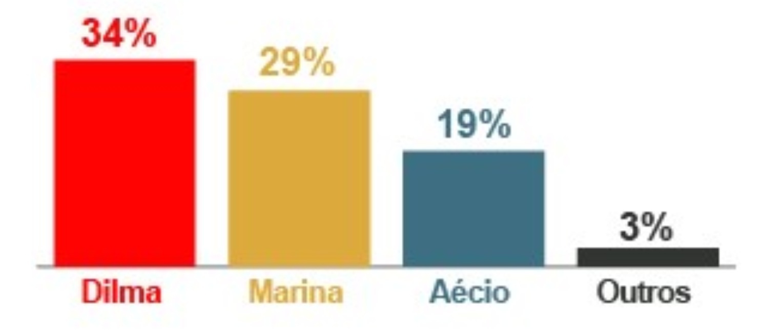 Pesquisa Ibope divulgada nesta terça-feira (26) aponta Dilma Rousseff (PT) com 34% das intenções de voto para presidente da República e Marina Silva (PSB), com 29%. O candidato do PSDB, Aécio Neves, tem 19%, seguido de Pastor Everaldo (PSC) e Luciana Genro (PSOL), com 1% cada. Os outros seis candidatos somados acumulam 1%.