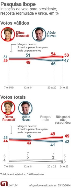 No levantamento anterior do instituto, divulgado no dia 23, Dilma tinha 54% e Aécio, 46%.