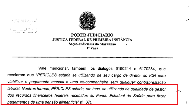 “Noutros termos, Péricles estaria, em tese, se utilizando da qualidade de gestor dos recursos financeiros federais recebidos do Fundo Estadual de Saúde para fazer pagamentos de uma pensão alimentícia”, constatou a PF.