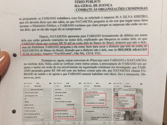 Entre as diversas páginas do documento obtido com exclusividade pelo blog do Neto Ferreira, Helder Aragão figura a maior parte. São grampos, conversas telefônicas e documentos encontrados com o nome do prefeito que evidenciam sua participação junto aos demais envolvidos: o empresário Fabiano Bezerra e o ex-presidente da Assembleia Legislativa do Estado e pai do deputado estadual Eduardo Braide, Carlos Braide.