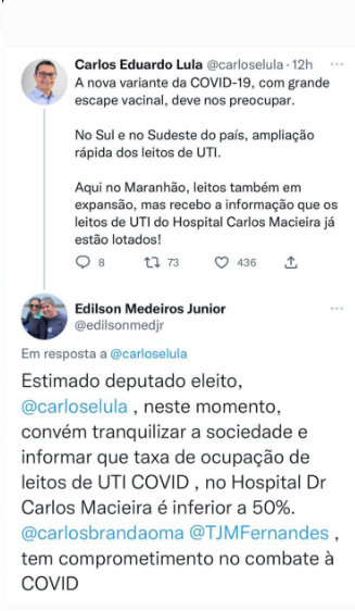 “Estimado deputado eleito, @carloselula , neste momento, convém tranquilizar a sociedade e informar que taxa de ocupação de leitos de UTI COVID , no Hospital Dr Carlos Macieira é inferior a 50%.”