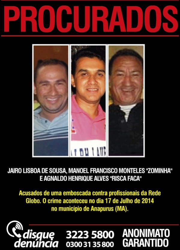 O Disque-Denúncia divulgou, na manhã desta sexta-feira (25), as fotos de três suspeitos de terem participado da emboscada à equipe da Rede Globo, no município de Anapurus, que fica a 183 km de São Luís, no Maranhão.