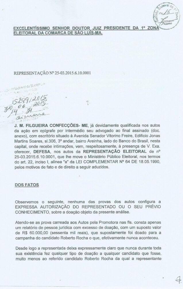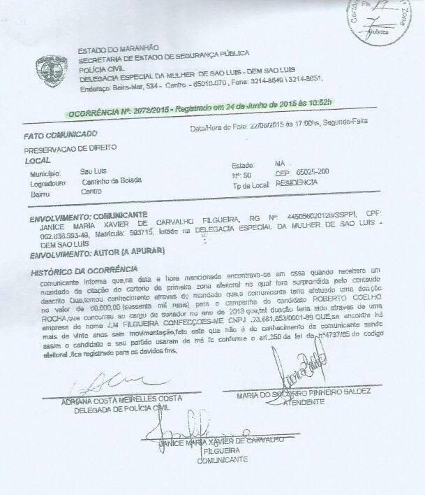 Janice afirmou, segundo documentos obtidos pelo Blog do Neto Ferreira, que tomou conhecimento que teria doado R$ 60 mil para a campanha do então candidato ao Senado da República, Roberto Rocha, por meio de uma notificação do Ministério Público Eleitoral (MPE), que identificou doações de campanha acima do permitido por Lei realizado pela J.M. Filgueira Confecções.