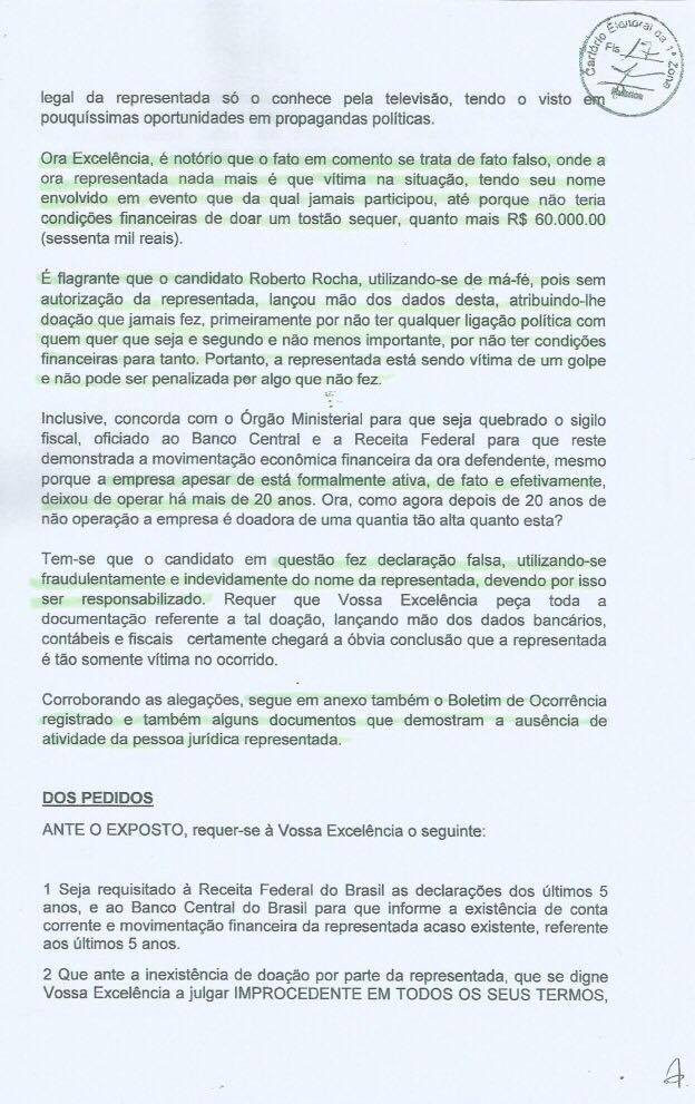 Janice alegou que o senador Roberto Rocha usou de má-fé, sem autorização dela utilizou seus dados, atribuindo doações que jamais fez e pede que ele seja penalizado pela doação ilegal de campanha.