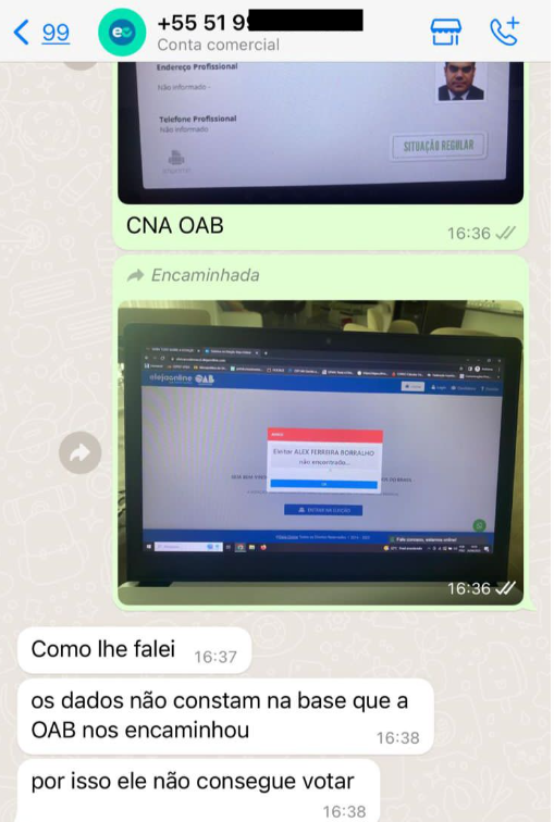 Em diálogo pelo aplicativo de mensagem WhatsApp, a empresa confirma que o nome do jurista não foi enviado pela Seccional maranhense, mesmo estando apto a participar da eleição, conforme mostra a declaração da divisão financeira da Ordem garantindo que ele estava com a anuidade quitada.