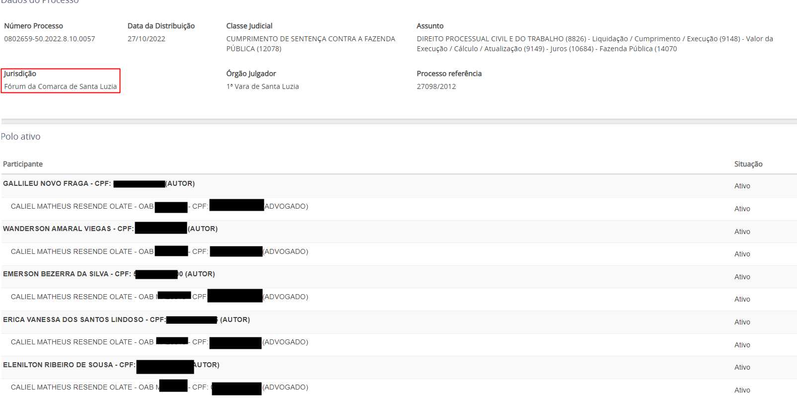 Dados do processo movido pelo comandante geral da Polícia Militar, Emerson Bezerra, e demais militares, contra o Estado na Comarca de Santa Luzia.