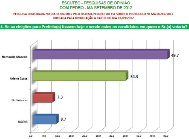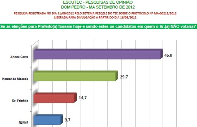 A pesquisa Escutec foi realizada nos dias 13 e 14 deste mês, onde foram entrevistados 300 eleitores, e foi registrada no Tribunal Regional Eleitoral do Maranhão (TER-MA), sob o protocolo de Nº MA 00218/2012. A margem de erro de 5 pontos percentuais para mais ou para menos.