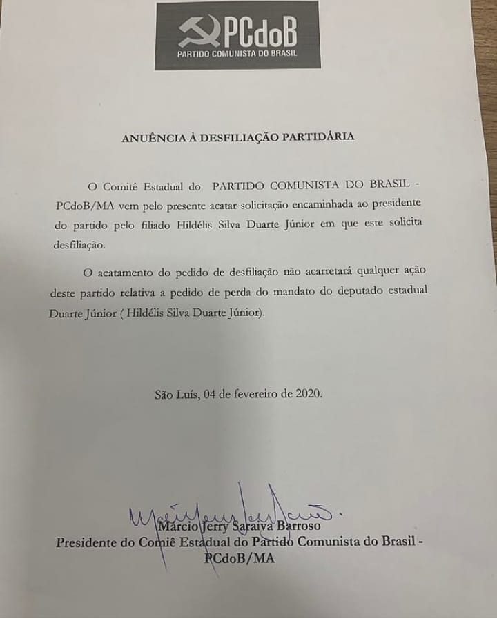 Documento obtido pelo Blog do Neto Ferreira mostra que o PCdoB aceitou o pedido de desfiliação do deputado estadual Duarte Júnior.