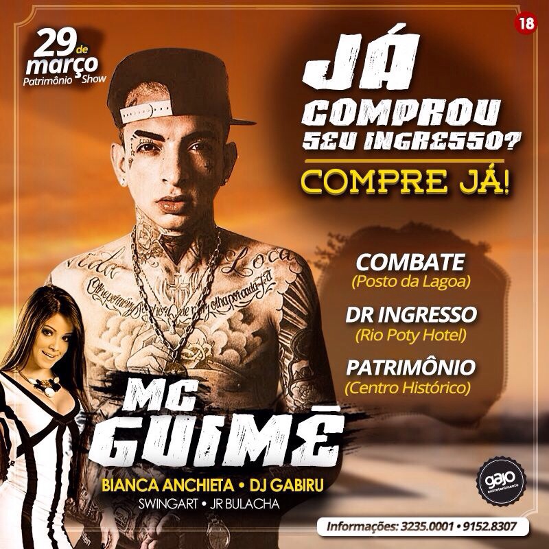 O Mc Guimê, que é o precursor do segmento Funk ostentação preparou um repertório todo especial para não deixar ninguém sem Ostentar, com um show inovador ele arrasta multidões por onde passa.
