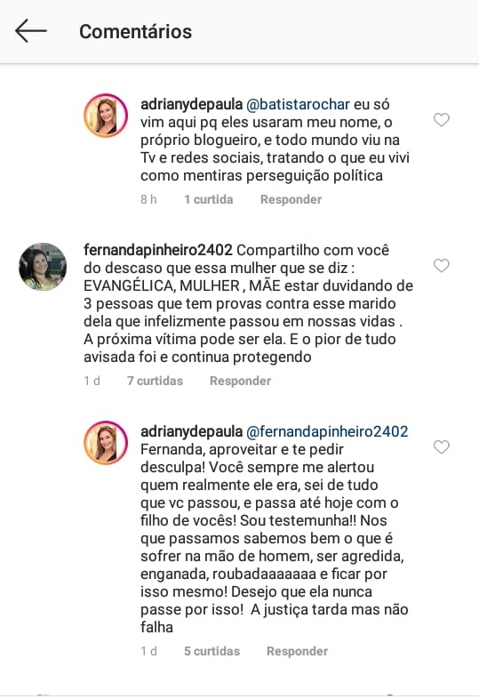 A jornalista Adriany de Paula respondeu ao comentário pedindo desculpas a Fernanda e que a seguidora sempre a alertou do comportamento agressivo do marido da candidata ao Senado.