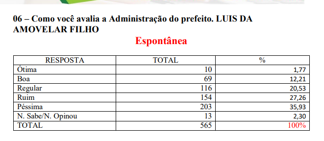 Durante o levantamento foi avaliada a gestão do atual prefeito Luís da Amovelar Filho. 35,9% responderam que acham péssima, 27,2% ruim, 20,5% regular, 12,2% boa e apenas 1,7% disse que é ótima. Não sabe ou não opinou 2,3%.
