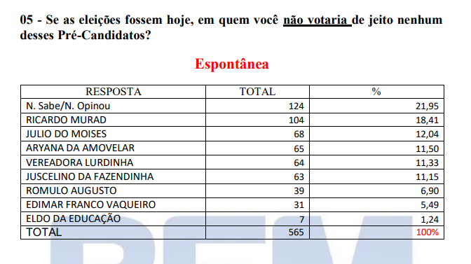 Também foi questionado em quem eles não votariam de jeito nenhum para prefeito. O ex-prefeito e ex-deputado Ricardo Murad foi campeão em rejeição com 18,41%. Depois vem Júlio do Moisés com 12%, Aryana da Amovelar com 11,5%, Vereadora Lurdinha com 11,3%, Juscelino da Fazendinha com 11,1%, Rômulo 6,9%, Edimar Franco 5,4% e Eldo da educação 1,2%. Não sabe ou não opinou 21,9%.