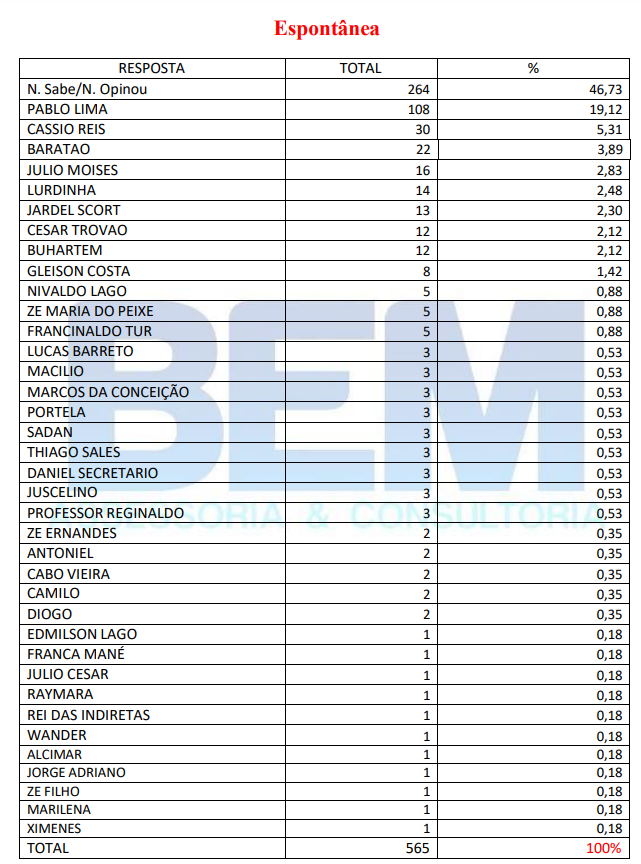 O Instituto Bem também sondou sobre os pré-candidatos a vereador. 19,12% escolheram Pablo Lima, em seguida vem Cassio Reis 5,31%, Baratao 3,89%, Julio Moises 2,83%, Lurdinha 2,48% Jardel Scort com 2,30%, Cesar Trovao 2,12%, Buhartem com 2,12%, Gleison Costa 1,42%, Nivaldo Lago, Ze Maria Do Peixe e Francinaldo Tur pontuaram em 0,88%.
