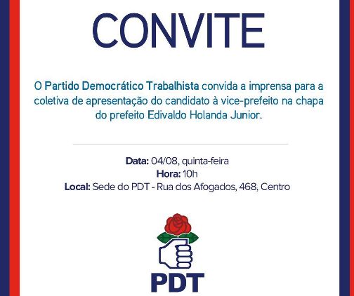 “O Partido Democrático Trabalhista convida a empresa para coletiva de apresentação do candidato à vice-prefeito na chapa do prefeito Edivaldo Holanda Júnior”, diz a nota encaminhada na noite desta quarta-feira (03).