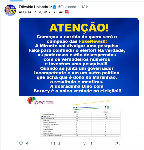 “Atenção! Começou a corrida de quem será o campeão das fake news! A Mirante vai divulgar uma pesquisa fake para confundir o eleitor. Na verdade, os poderosos estão desesperados com os verdadeiros números e inventam uma pesquisa! Quando se junta um governador incompetente e um outro político que se acha dono do Maranhão o resultado é mentiras!”