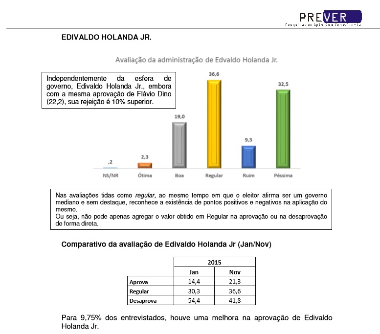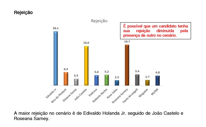 De acordo com a pesquisa, realizada entre em novembro deste ano, 26,1% dos eleitores não votariam em Edivaldo Holanda Júnior. Roseana Sarney vem em segundo lugar com 19,7% de rejeição, e em terceiro aparece João Castelo com 19% .