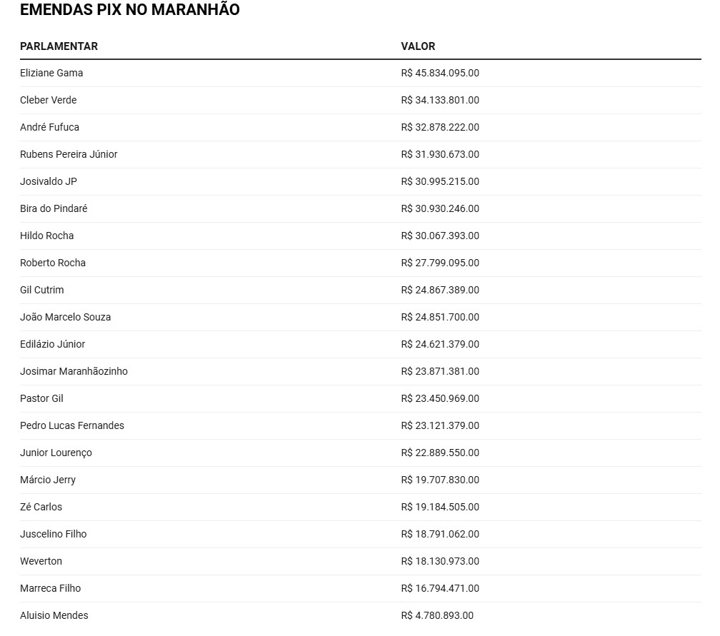 A lista continua com Gil Cutrim (R$ 24.867.389,00), João Marcelo Souza (R$ 24.851.700,00) e Edilázio Júnior (R$ 24.621.379,00), além de Josimar Maranhãozinho (PL/MA), que recebeu R$ 23.871.381,00.