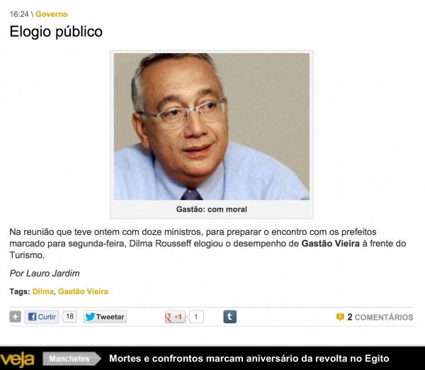 Elogios a Gastão Vieira 26/01/201326/01/2013 | PÁGINA PRINCIPAL, Política Radar On-line, Por Lauro Jardim Navegação de Post Atenção concurseiros! Edital de concurso para Auditor Fiscal será lançadoProgramação do Carnaval de Urbano Santos é divulgada