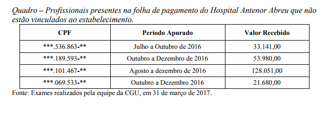 Durante uma fiscalização na Prefeitura de Pinheiro, a Controladoria-Geral da União detectou que no período de julho a dezembro de 2016, na gestão de Filuca Mendes (PMDB), pessoas receberam salários sem prestar serviços no Hospital Antenor Abreu.