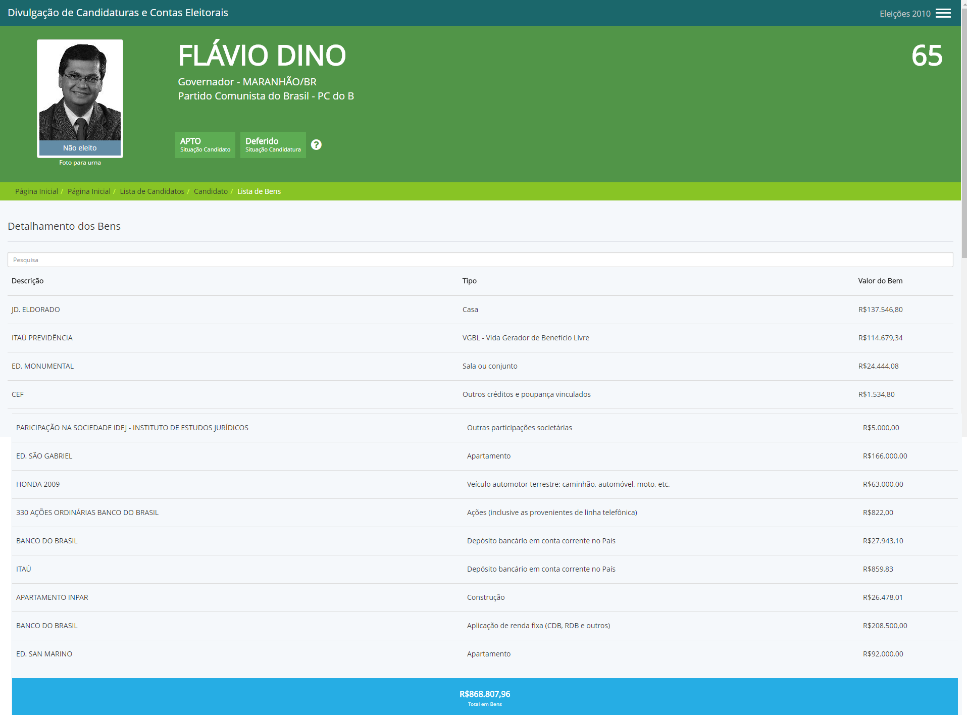 Em 2010, o comunista declarou ao TSE que possuía R$868.807,96 mil em bens, entre eles estavam uma casa no Jardim Eudorado, avaliada em R$ 137.546,80 mil; uma sala comercial de R$ 24.44,08 mil. dois apartamentos, sendo um de R$ 166 mil e outro de R$92.000,00; um veículo Honda, avaliado em R$ 63 mil; além de depósitos em poupanças, previdência privada.