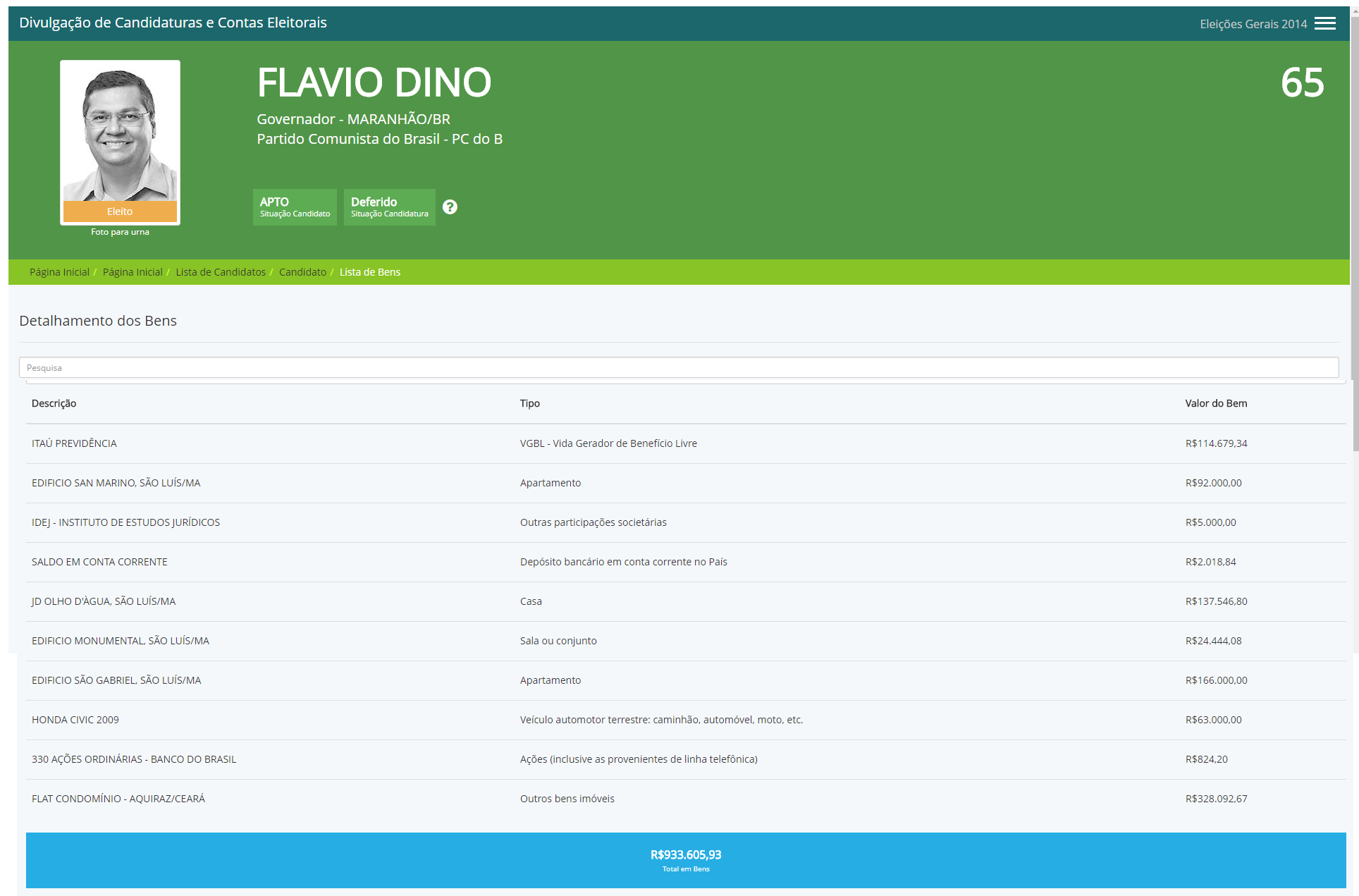 Já em 2014, Dino afirmou que tinha R$ 933.605,93 mil, sendo VGBL – Vida Gerador de Benefício Livre de R$114.679,34 mil, uma casa de R$ 137.546,80 mil, três apartamentos, sendo um de R$ 328.092,60 mil, outro de R$ 92 mil e um de R$ 166 mil, uma sala comercial de R$ 24.444,08 mil, um veículo de R$ 63 mil, R$ 5 mil em sociedade no Instituto de Estudos Jurídicos, R$ 2.018,84 em saldo na conta corrente e R$ 824,20 mil em ações.