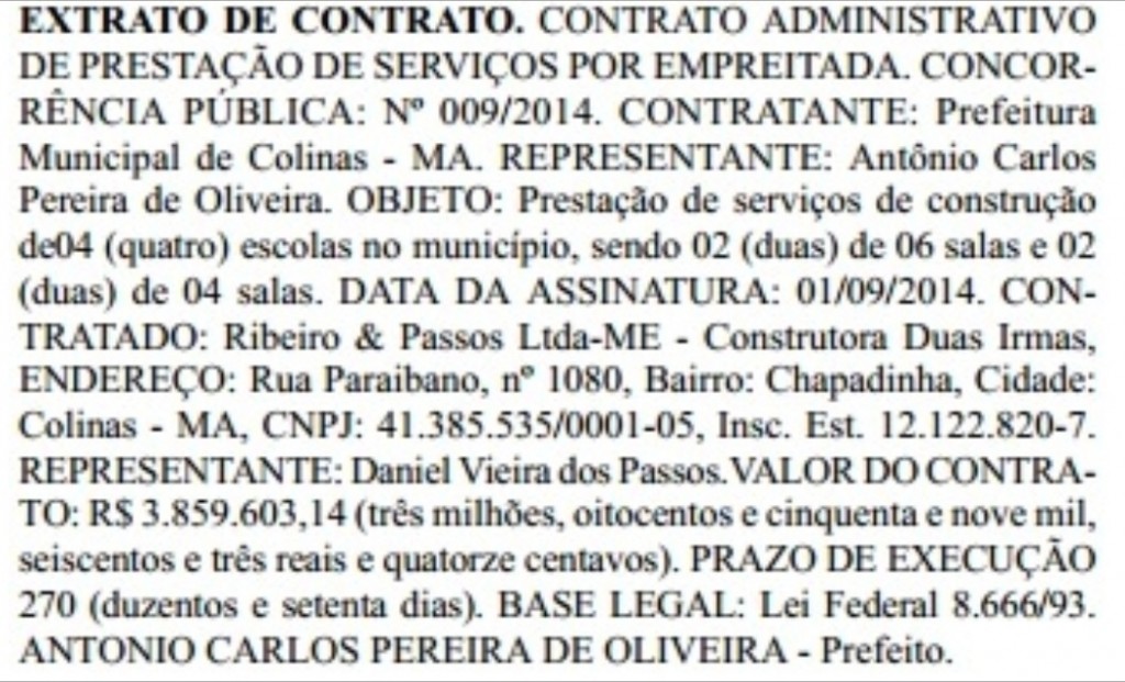 A prefeitura realizou um contrato de cifras milionárias com a empresa Ribeiro & Passos Ltda-Me – Construtora Duas Irmãs. A mesma receberá um valor de R$ 3.859.603,14 (três milhões, oitocentos e cinqüenta e nove mil, seiscentos e três reais e quatorze centavos), para prestar serviços de construção de quatro (04) escolas no município, sendo duas (02) de seis (06) salas e duas de quatro (04) salas.