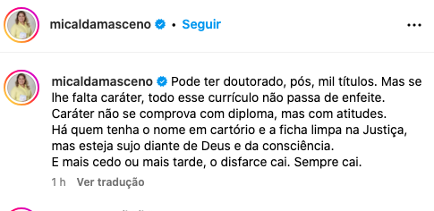 Após a postagem, Mical Damasceno reagiu: “Pode ter doutorado, pós, mil títulos. Mas se lhe falta caráter, todo esse currículo não passa de enfeite”.