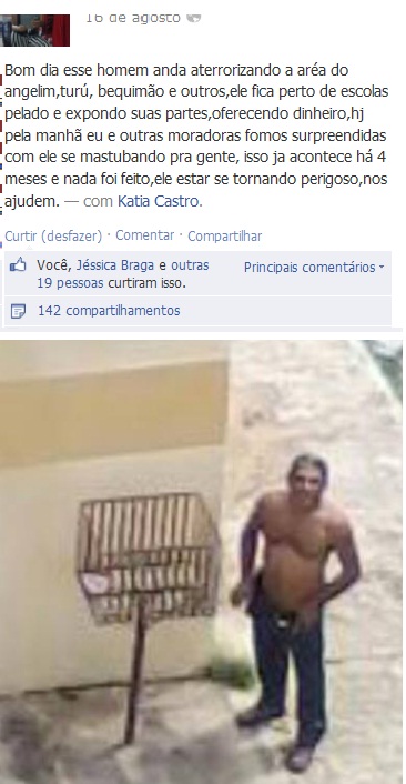 Moradores usaram as redes sociais para denunciar a ação desse criminoso. “Hoje pela manhã eu e outras moradoras fomos surpreendidas com ele se masturbando no meio da rua, isso já acontece há 4 meses e nada foi feito,ele está se tornando perigoso,nos ajudem” Escreveu a moradora no seu perfil do Facebook.