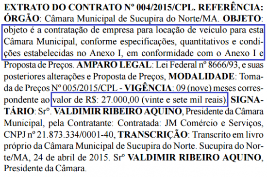 Durante nove meses, a câmara municipal de Sucupira do Norte, cidade que possui quase 11 mil habitantes, contará com os serviços da JM Comércio e Serviços, que conforme descreve o extrato de contrato, é responsável pela locação de veículos.