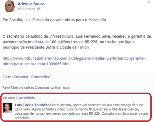 Em comentário postado via Facebook da matéria do Blog Ademar Sousa – um dos maios lidos de Timon -, Luis Carlos alerta que o secretário Luis Fernando poderá crescer o nariz diante de tamanha mentira. Uma falta de respeito tremenda de assessor do deputado que faz parte da base do governista.