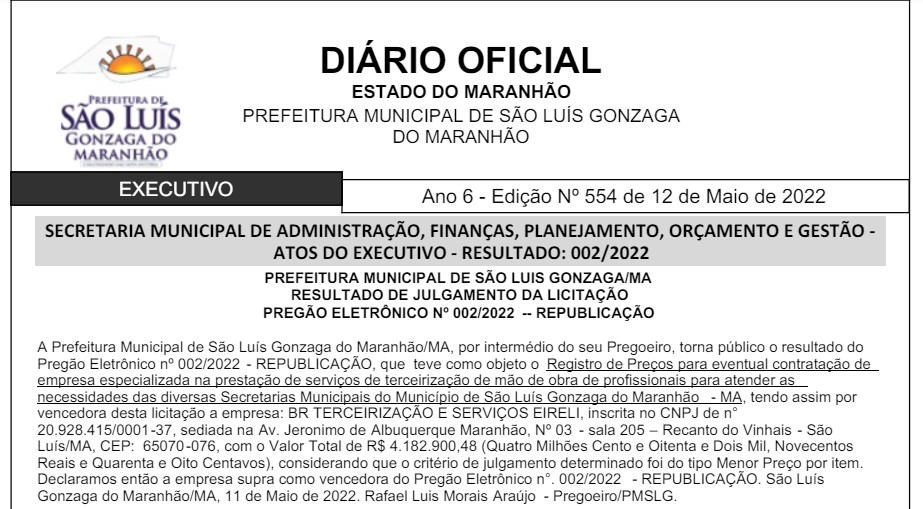 A contratação milionária previa o fornecimento de mão de obra terceirizada e teve o aval do pregoeiro, Rafael Luis Morais Araujo, e do secretário de Administação, Antonio Rafael Nani, que foram afastados dos cargos por determinação da Vara Especial Colegiada dos Crimes Organizados de São Luís a pedido do Ministério Público.