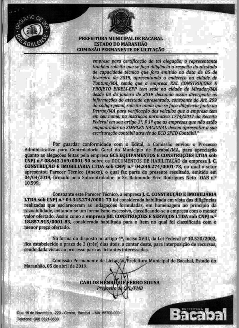 Apesar dos questionamentos feitos, o presidente da Comissão Permanente de Licitação da Prefeitura de Bacabal, Carlos Henrique Ferro Sousa, resolveu manter o contrato com a empreiteira.