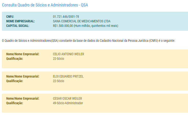 O Blog do Neto Ferreira apurou que a Sana Comercial tem como sócios proprietários Celio Antonio Weiler, Eloi Eduardo Prizel e Cesar Oscar Weiler. A empresa atua no fornecimento de material hospitalar e odontológicos.