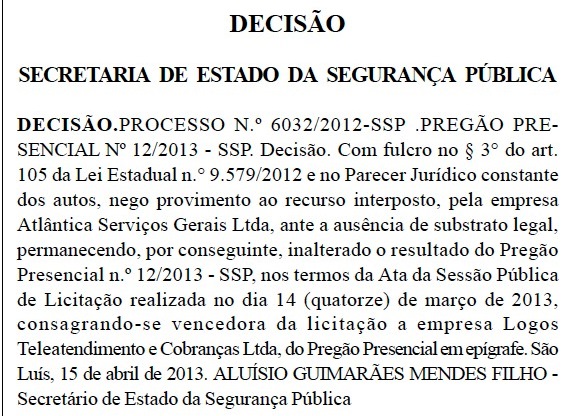 A Secretaria de Segurança Pública do Maranhão negou provimento ao recurso impetrado pela empresa Atlântica Serviços Gerais Ltda., do ex-sócio e grande amigo de Jorge Murad, marido de Roseana.