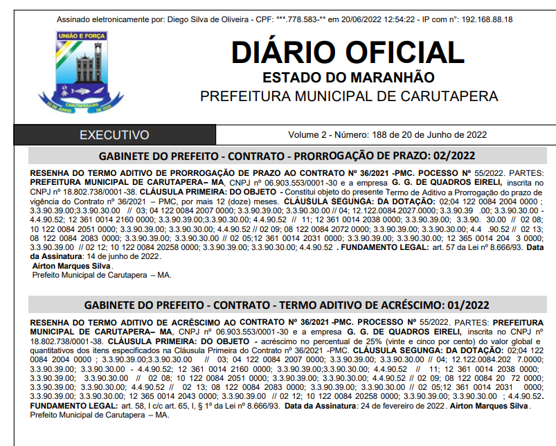 O Blog também realizou pesquisas pelo Portal da Transparência municipal buscando ter acesso ao acordo contratual inicial, porém não obteve sucesso. Em junho de 2022, a gestão de Airton Marques Silva publicou dois aditivos em nome da empresa prorrogando a vigência para mais 12 meses e fazendo um acréscimo de 25% no valor global do contrato.