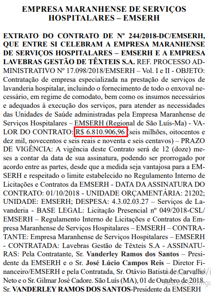 De acordo com o Diário Oficial, o acordo contratual prevê a prestação de serviços de lavanderia hospitalar, incluindo o fornecimento de todo o enxoval necessário, em regime de comodato, bem como os insumos necessários e adequados à execução dos serviços, para atender as necessidades das Unidades de Saúde administradas pela EMSERH.