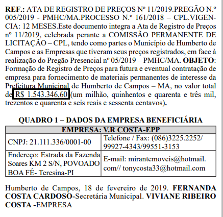 R$ 1.543.346,60 milhão. Esse é o valor que a Prefeitura de Humberto de Campos vai gastar com materiais permanentes.