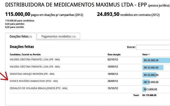 Em forma de agraciar a empresa que doou apenas R$ 10 mil reais, a prefeita contratou a Distribuidora de Medicamentos Maximus Ltda., por mais de R$ 4 milhões chamando atenção dos órgãos federais pela exorbitância das cifras.