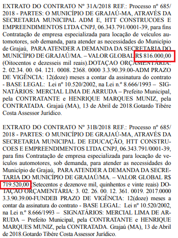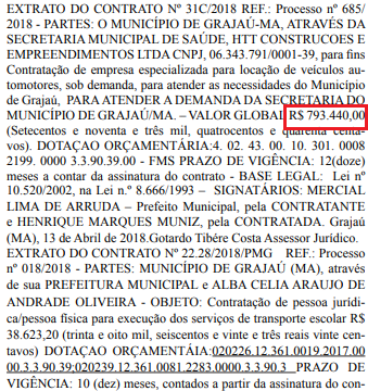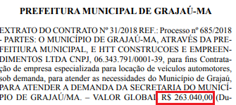 Os valores que a prefeitura de Grajaú vai pagar para a empresa ultrapassam os Dois milhões, R$ 263.040,00 (Duzentos e sessenta e três mil e quarenta reais), R$ 816.000,00 (Oitocentos e dezesseis mil reais), R$ 719.520,00 (Setecentos e dezenove mil, quinhentos e vinte reais), R$ 793.440,00 (Setecentos e noventa e três mil, quatrocentos e quarenta centavos).